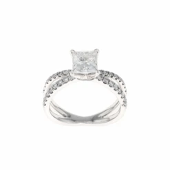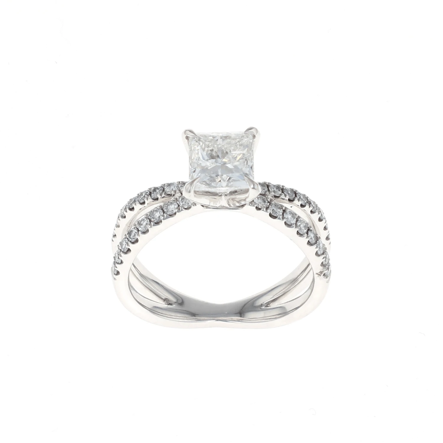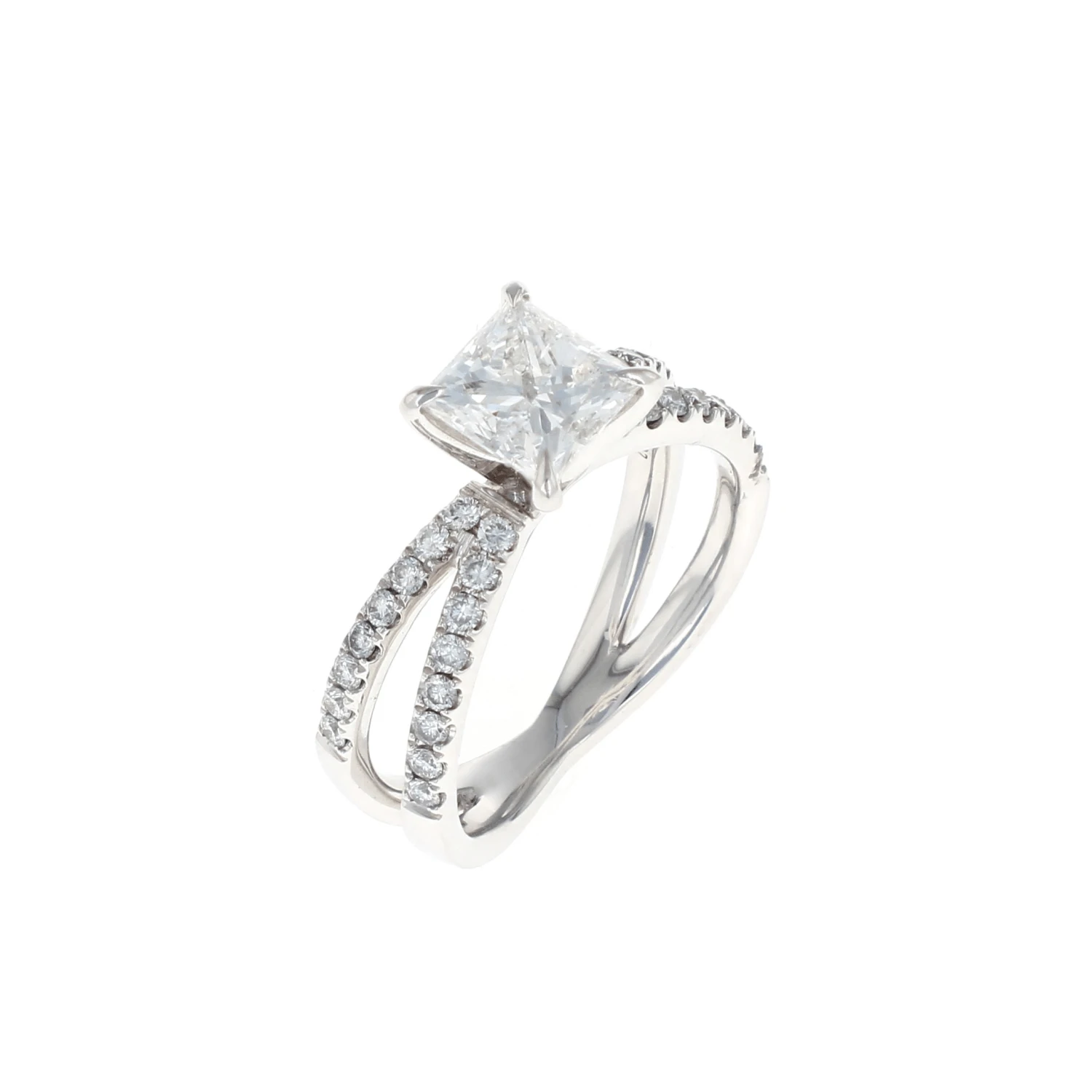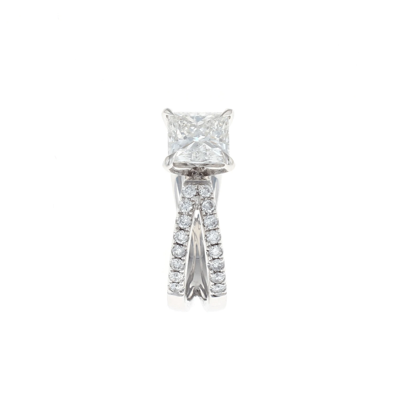 This Complete engagement ring with a beautiful 1.41CTW FG/I1 Princess Center stone and a 1/2 way split shank semi mount set in platinum is a romantic way to ask, “Will you marry me?”