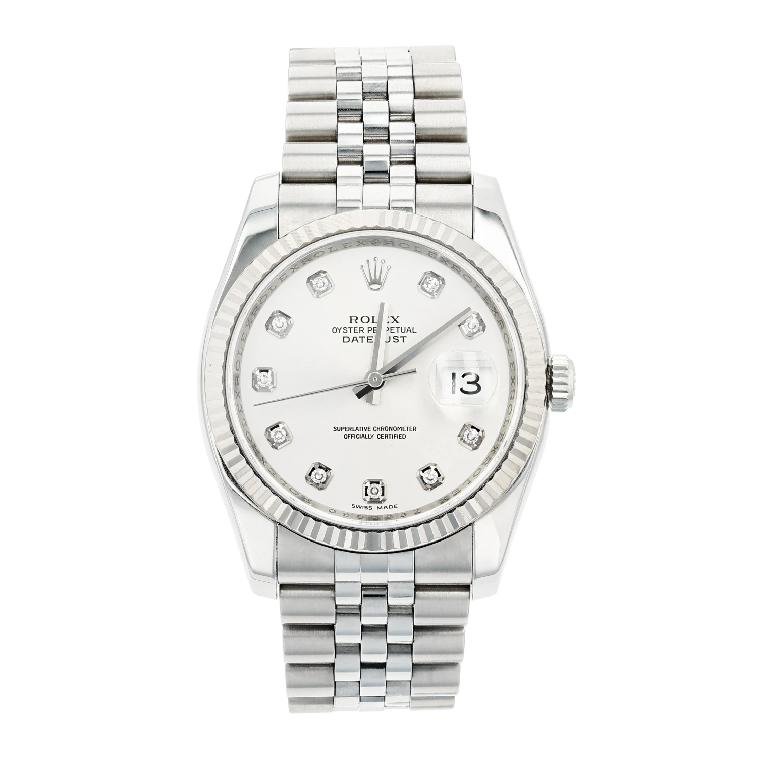 Pre Owned Rolex 116234 Datejust Oystersteel 36mm w/ Fluted Bezel, Silver Dial w/Diamond Markers, Jubilee Band 7 Screws. YEAR: 2010