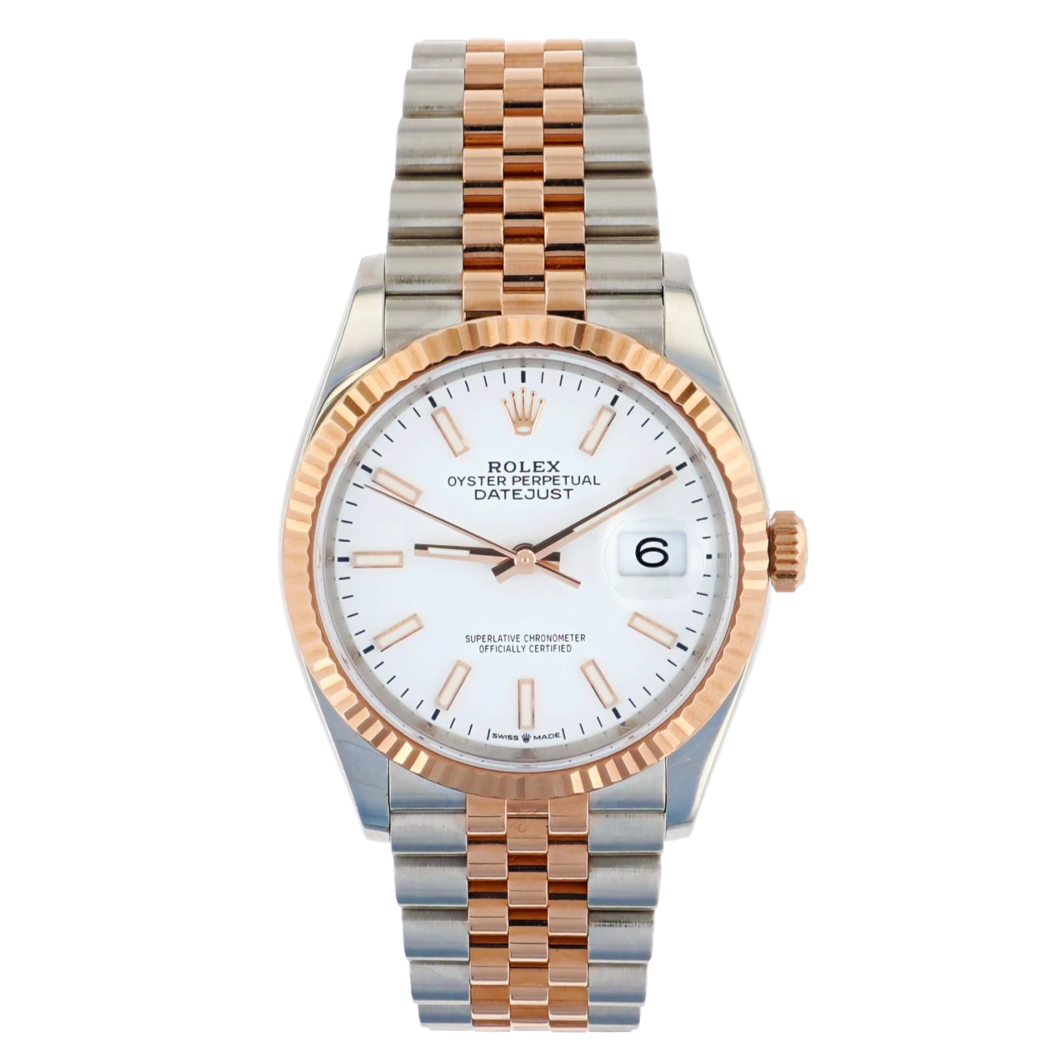Pre Owned Rolex 126231 Datejust Rolesor Oystersteel & 18K Everose Gold, 36mm. White Dial, Bar Markers, 18K Everose Gold Fluted Bezel, Jubilee Band.