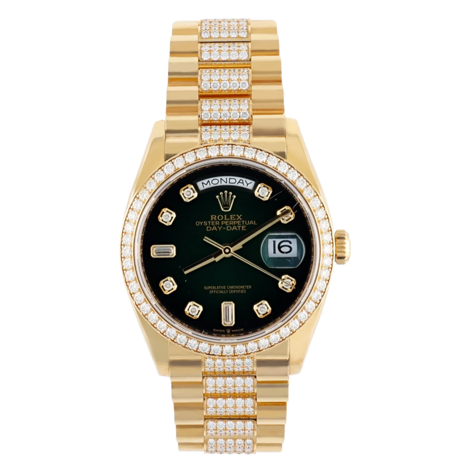 Pre Owned Rolex 128348RBR Presidential Day-Date 18K Yellow Gold 36mm. 18K Yellow Gold Diamond Bezel, Green Dial w/ Diamond Markers, Day & Date Windows, Factory set Diamond Presidential Band YEAR: 2021