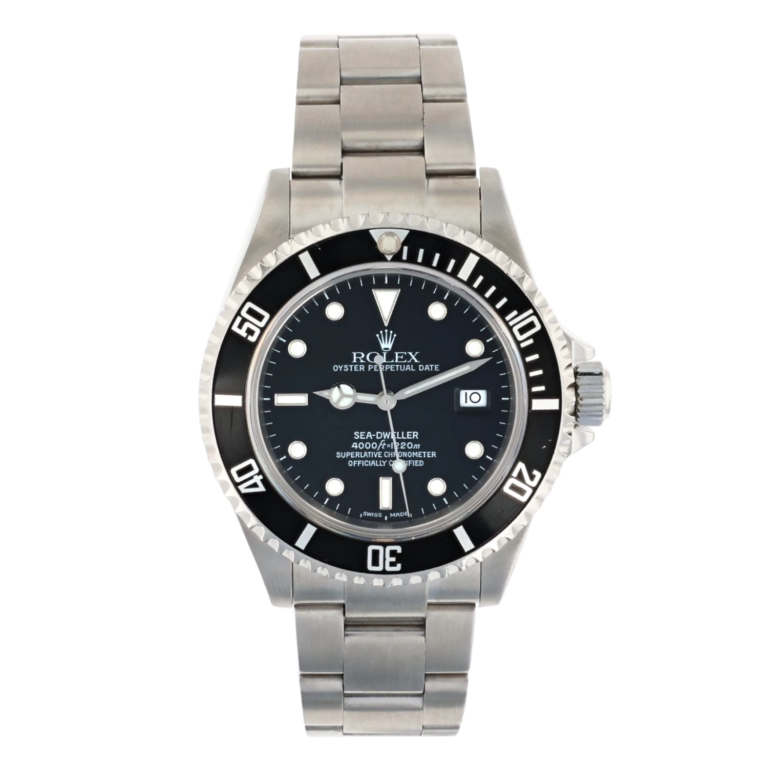 Pre Owned Rolex 16660T Sea-Dweller Oystersteel 40mm. Helium Escape Valve, Unidirectional Rotatable Bezel w/ Black 0-60 minute scale Aluminum insert, Black Dial, Superluminova, Flat Sapphire Crystal, F Serial Number, Date @ 3 o’clock, Oyster Band. YEAR: 2003