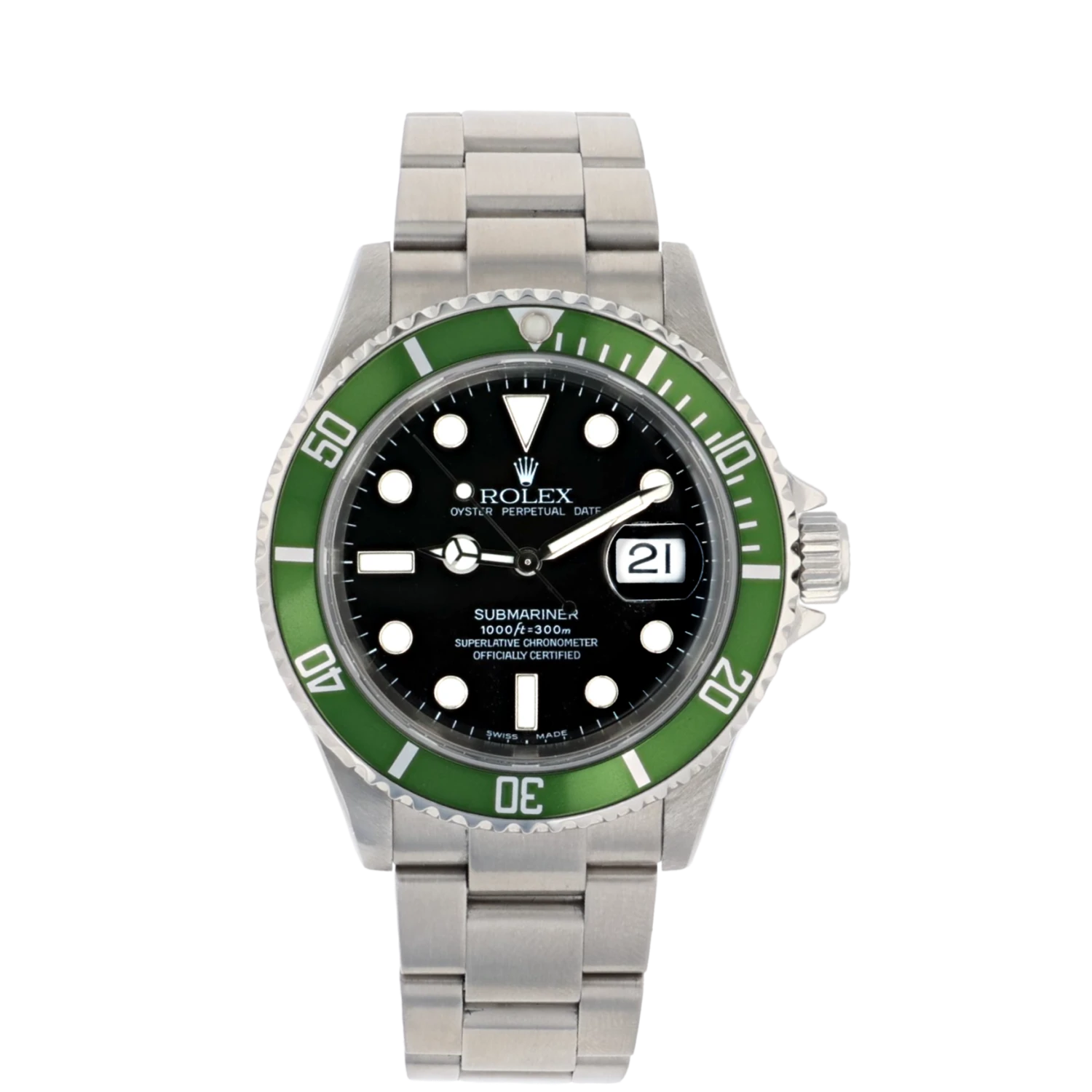 Pre Owned Rolex 16610LV Submariner “Kermit” 40mm. First Year F Serial Number. Black Dial, Date Window, Unidirectional Rotating Bezel, Green “Kermit” Insert