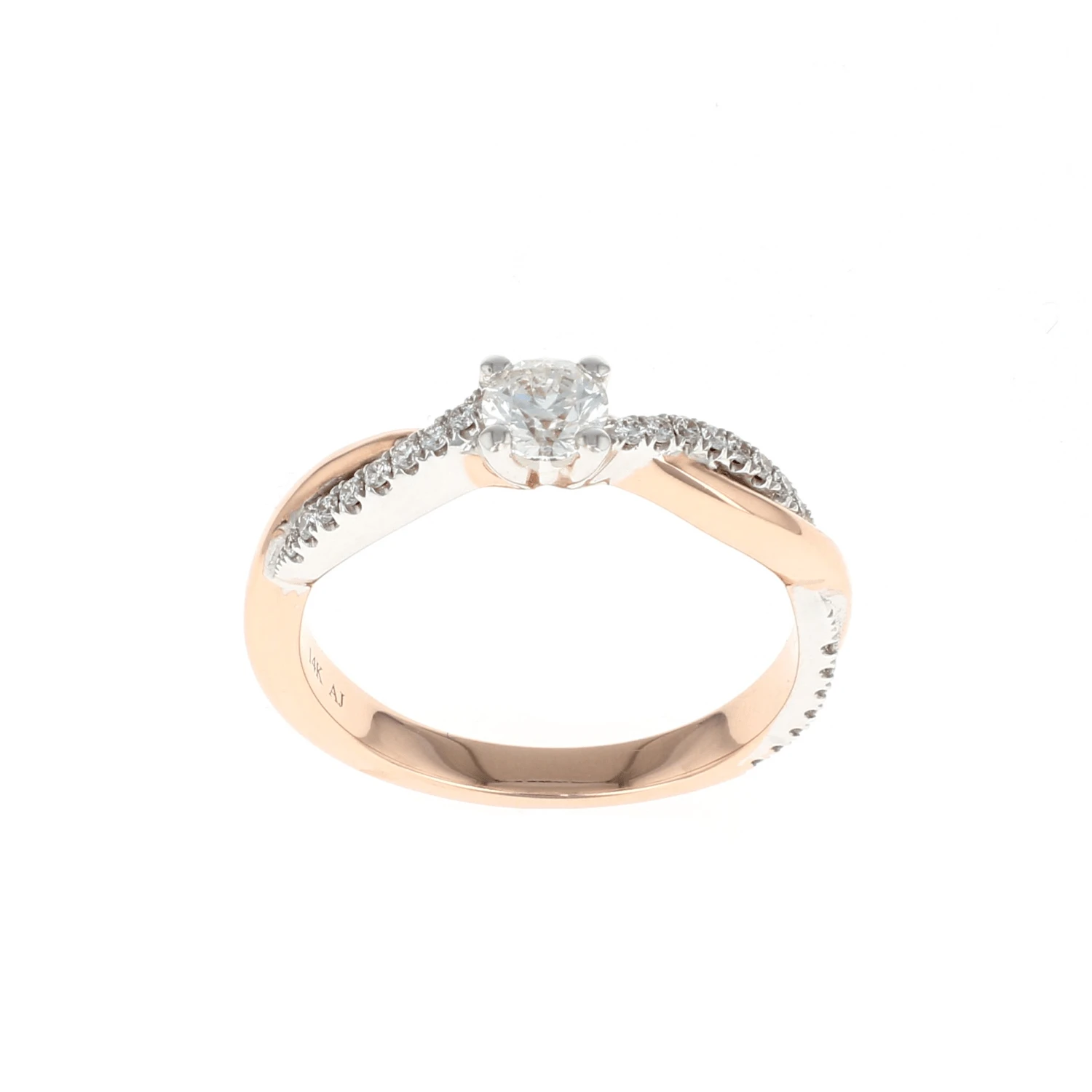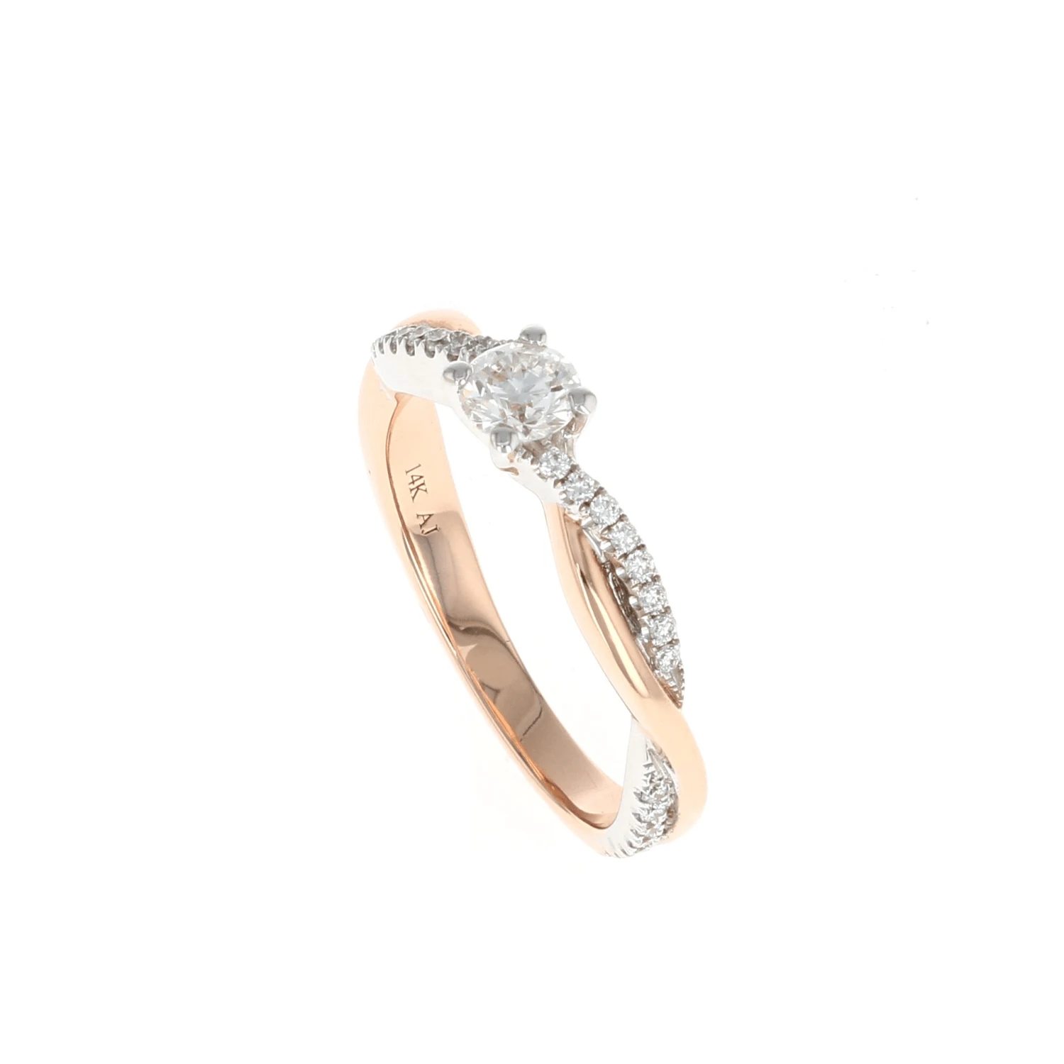 This 14K Rose Gold engagement ring has a round center diamond accented with a white gold crossover pave semi mount. A beautiful way to ask, “Will you marry me?”
