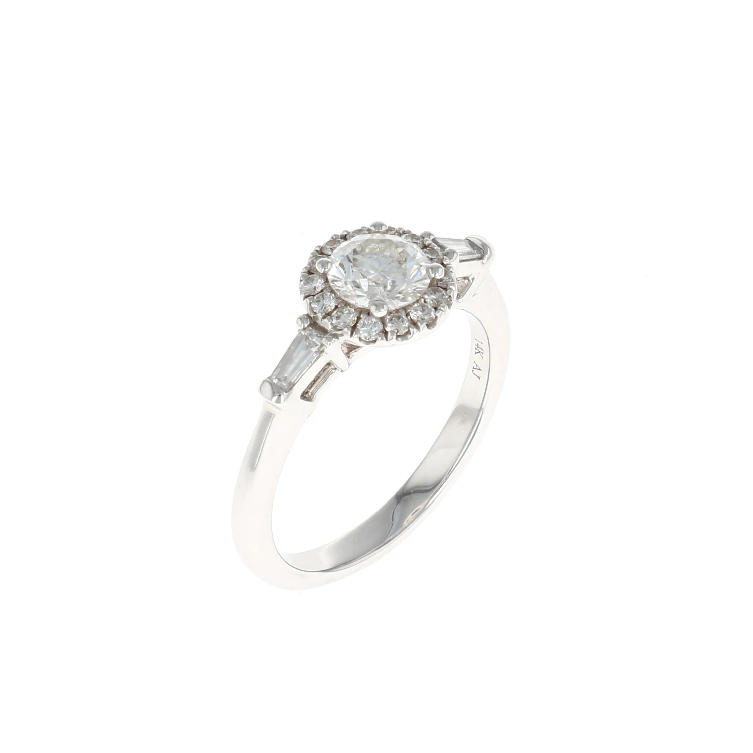 This engagement ring features a round shaped center diamond with a halo and baguette on either side set in 14K white gold.