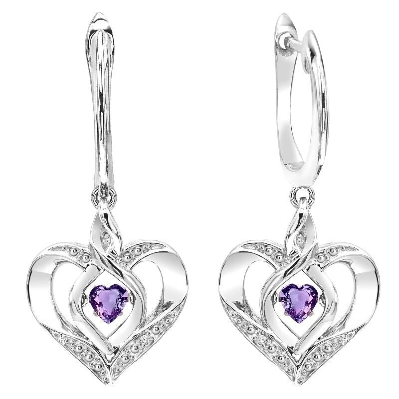 These Silver Rhythm of Love drop earrings feature a cut-out Silver heart set with 14 round-cut diamonds and a Created Amethyst gemstone at center.