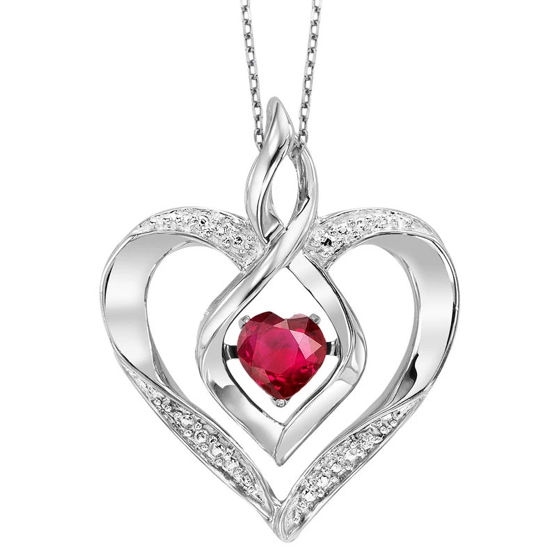 This silver rhythm of love pendant features a cut-out Silver heart pendant set with 7 round-cut diamonds and a Created Ruby gemstone at center.