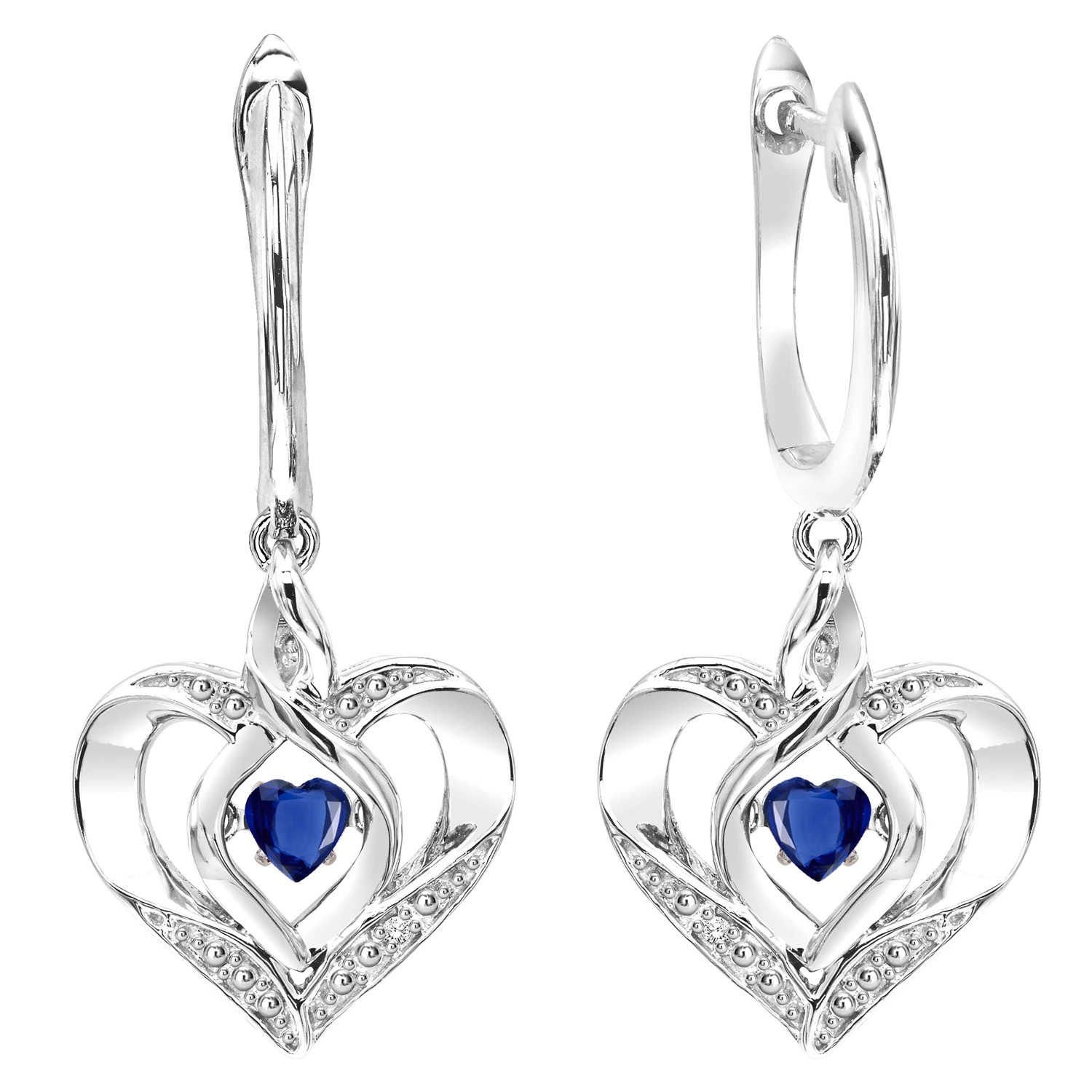 These Silver Rhythm of Love drop earrings feature a cut-out Silver heart set with 14 round-cut diamonds and a Created Sapphire gemstone at center.