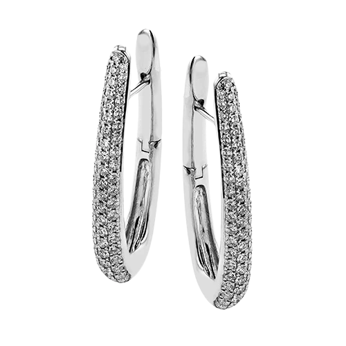 A modern take on the classic hoops, these elongated u-shaped earrings in 18k white gold have 3 sides of pave set diamonds 1.34 ctw., and a secure hinged latch closure
