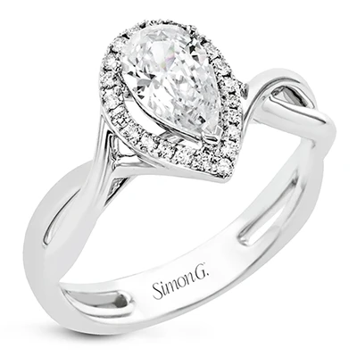 This modern engagement ring features a high polished twisted band culminating at the top with a pear shaped halo of round diamonds 0.11 ctw.