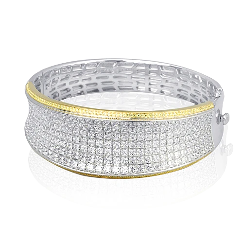 Offering a distinctive contemporary style, this bangle bracelet is white and rose gold is accented by an astounding 18.85 ctw princess cut white diamonds and .79 round pink diamonds.