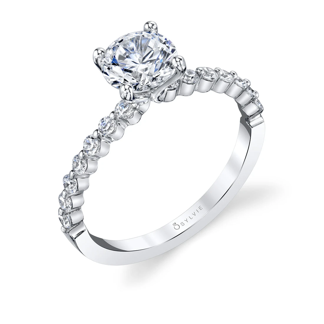 A Sylvie Designed Athena Solitaire Engagement Ring. This beautiful and on trend engagement ring features a four prong 3/4 carat round center stone semi mount and 0.29CTW round brilliant diamonds in a single shared prong setting that trails half way down the band. Pair this setting with Sylvie’s matching stackable wedding band, also in single prong form, to create the perfect wedding ring set for any trendy bride.