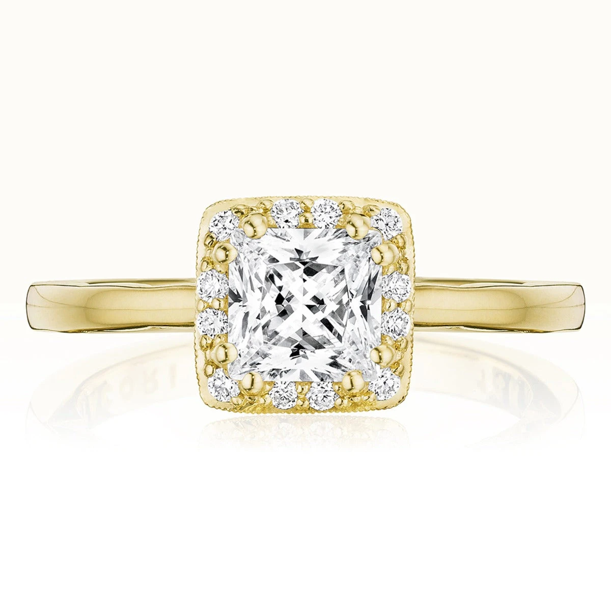 Love in bloom. The beauty in the simplicity of this princess cut diamond engagement ring is amplified by a brand new crescent inner face, with a diamond-cuddled detailing underneath the crescent.
