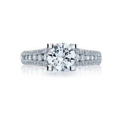 Graduated round diamonds and tapered rows of pavé lead to the round solitaire, set in a contemporary Cathedral Foundation. A Classic Crescent fabric, decorated with more diamond detailing, adds the TACORI Touch to the silhouette of the band.