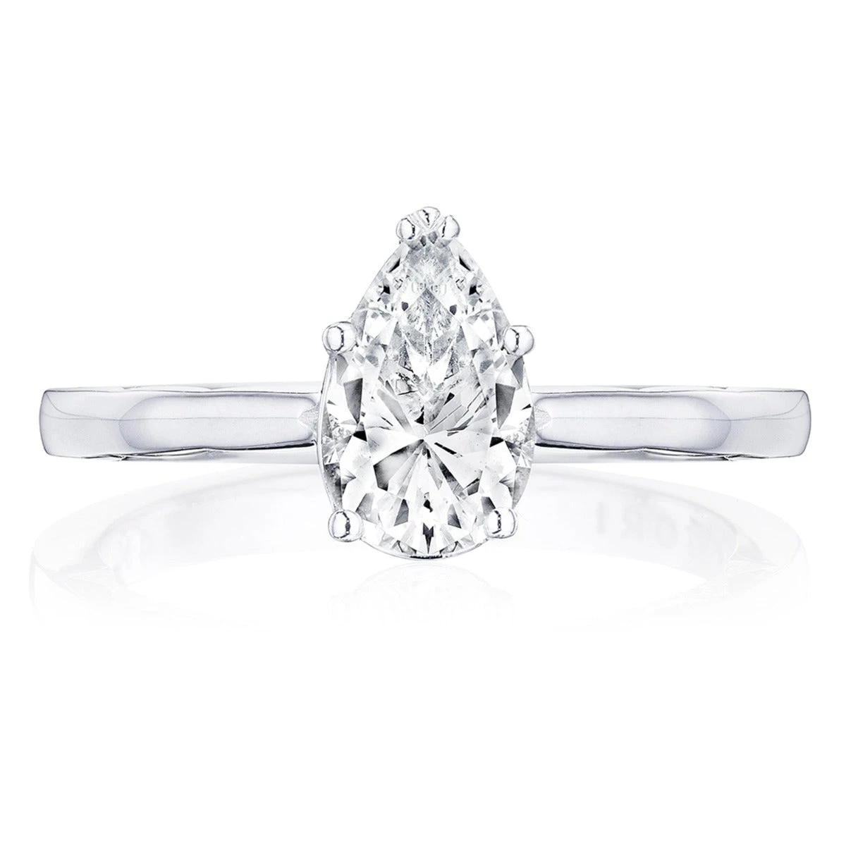 The beauty in the simplicity of this pear shaped diamond engagement ring is amplified by a brand new crescent inner face, with a diamond-cuddled detailing underneath the crescent.