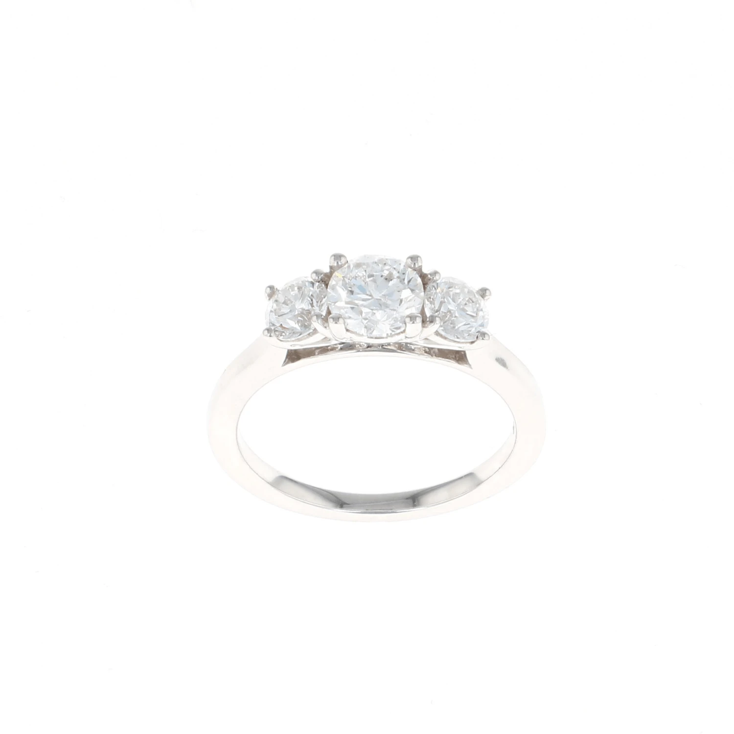 This complete engagement ring features three round shaped diamonds set in 14K white gold.