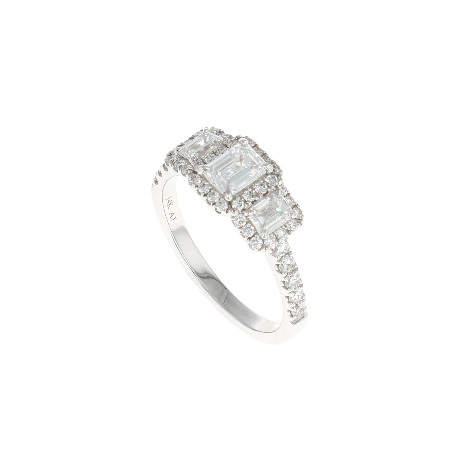 This complete engagement ring features three emerald shaped diamonds each with with a halo and 1/2 way pave mount in 14K white gold.