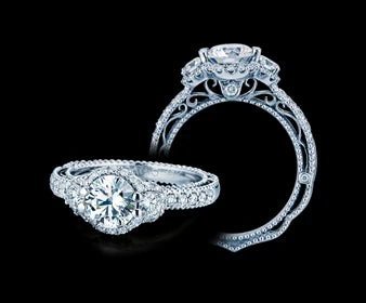 Modern yet classic, this round brilliant illuminates with pavé diamonds along the ceiling and milgrain detail. Perfect for any bride!