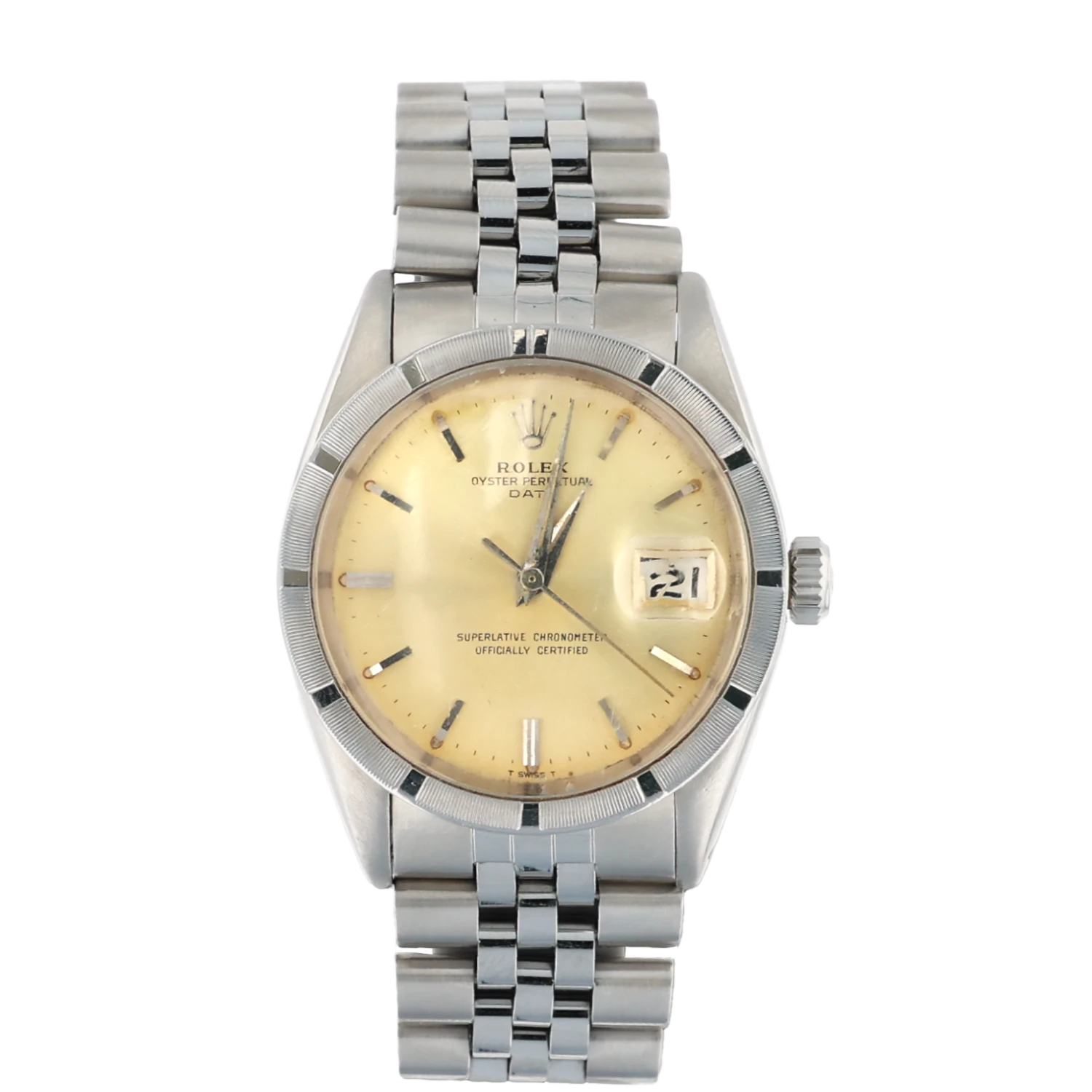 Pre Owned Vintage Rolex 1500 Oyster Perpetual Date Oystersteel 34mm. Index Marked Bezel, Acrylic Crystal, Champagne Dial w/ Bar Markers, Jubilee Band.