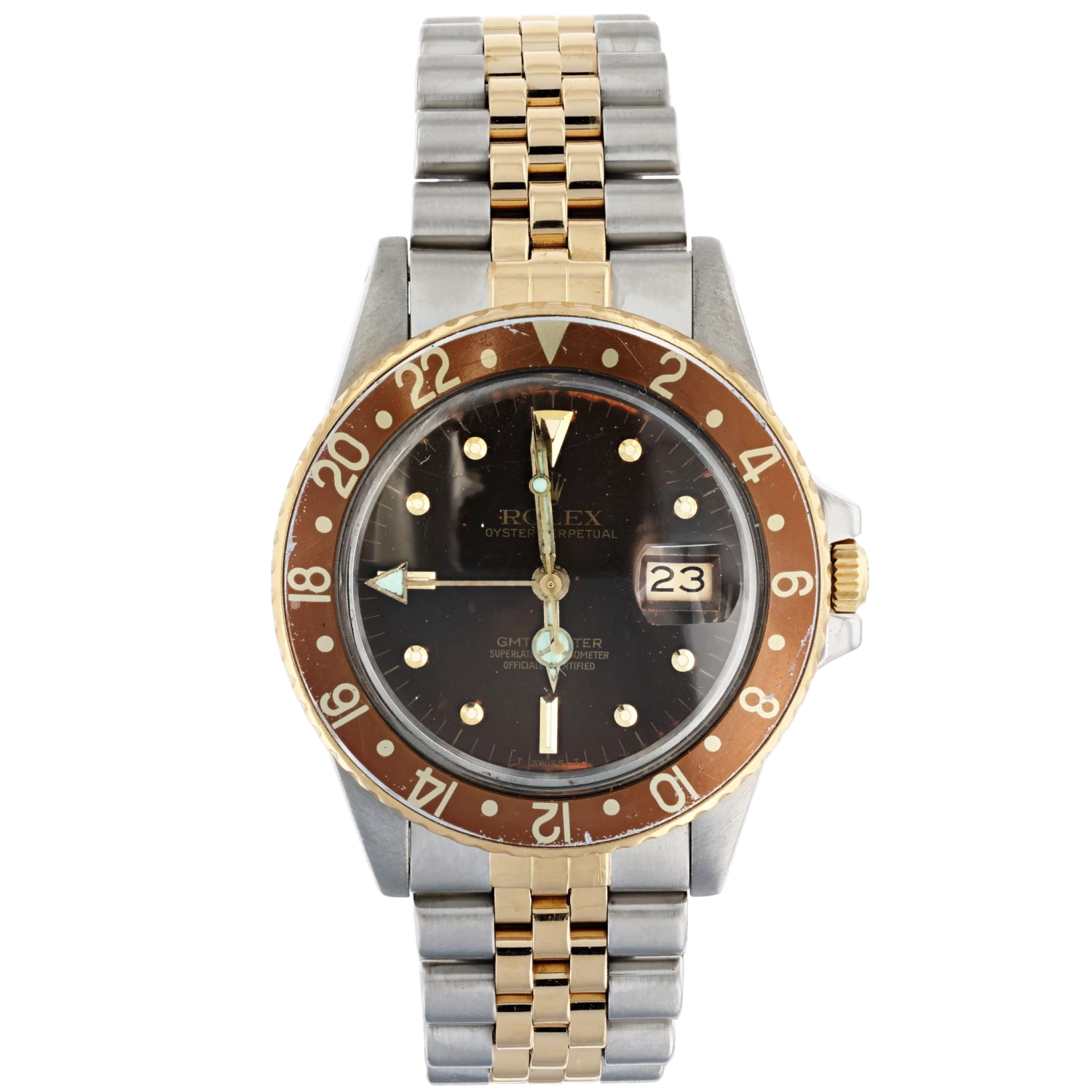 Pre Owned Vintage Rolex 16753 GMT Master “Root Beer” Rolesor Oystersteel & 18K Yellow Gold 40mm w/ beautiful brown “Root Beer” Bezel, Brown Dial w/ Tritium Hands & Hour markers, Acrylic Crystal, Jubilee Band Year: 1984