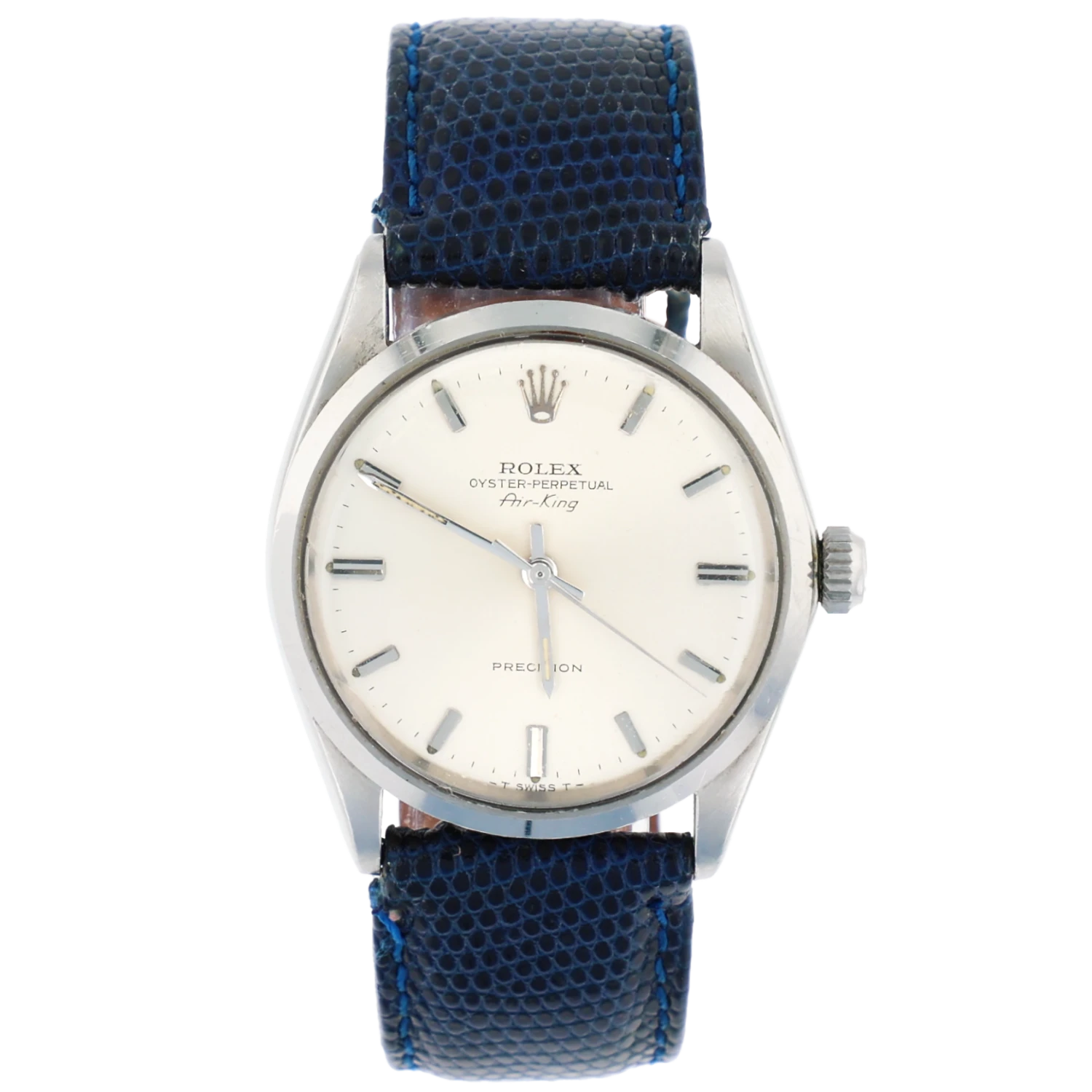 Pre Owned Vintage Rolex 5500 Air-King Oystersteel 34mm w/ Smooth Bezel, Sliver dial w/Bar Markers, Blue Leather Band YEAR: 1964